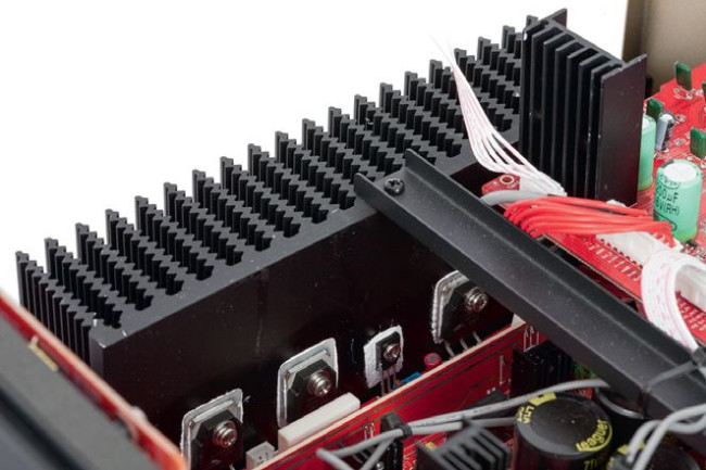 Zasilacz ulokowano dość nietypowo, przykręcając transformator toroidalny do wspornika przy jednej z bocznych ścianek, stąd nierównomierny rozkład masy (co jednak nie ma większego praktycznego znaczenia, gdy wzmacniacz stanie już na szafce).