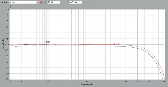 Czułość ustalono dokładnie na poziomie standardu 0,2 V, co może mieć wpływ na niski odstęp od szumu (78 dB), jednak dzięki wysokiej mocy dynamika osiągnęła równe 100 dB. Charakterystyki częstotliwościowe (rys. 1) wyglądają dobrze, ze spadkiem -3 dB przy 90 kHz dla 4 Ω i 100 kHz dla 8 Ω.