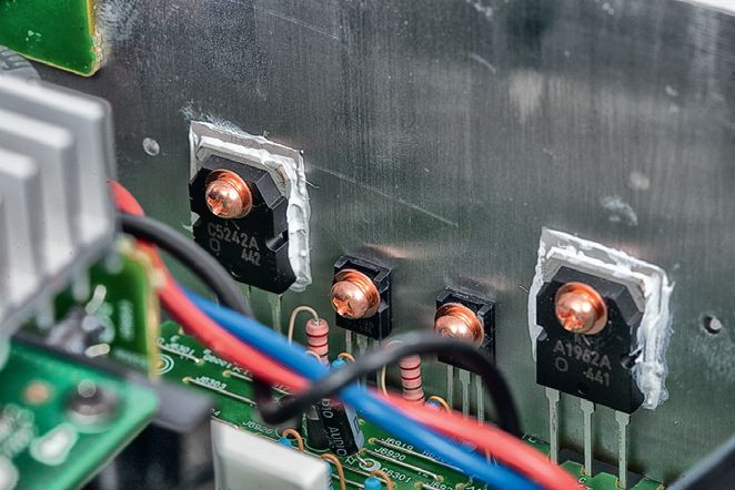 Końcówki mocy w klasie AB mają do dyspozycji obszerny radiator. W każdym kanale pracuje jedna para tranzystorów – elementy SA1962/2SC5242 produkcji Toshiby, które Onkyo (i siostrzana Integra) chętnie stosują w sprzęcie wielokanałowym; to tranzystory pozwalające uzyskać bardzo wysoką moc nawet z takiej skromnej konfiguracji.
