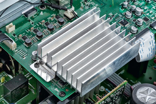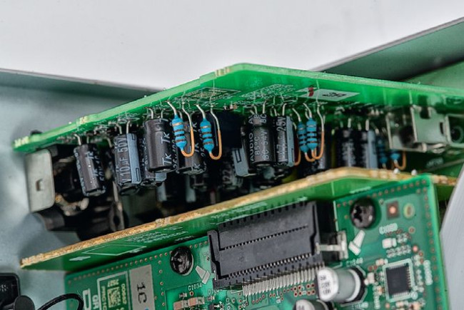 Większość elektroniki znajduje się na jednej dużej poziomej płytce, dodatkowy moduł obejmuje w zasadzie tylko wejścia optyczne i współosiowe. Dostępu do sekcji sieciowej broni duży radiator, obsługą wejścia HDMI zajmuje się układ Analog Devices. Od góry nie widać przetwornika C/A, który prawdopodobnie wlutowano po drugiej stronie płytki.
