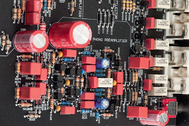 Producent chwali zastosowaną sekcję gramofonową i faktycznie ma ku temu powody. Nie chodzi tylko o obsługę różnego rodzaju wkładek; umieszczony w ramach głównej płytki moduł phono również wykorzystuje wyłącznie elementy dyskretne (a znacznie taniej jest budować obwody wymagające dużego wzmocnienia na scalakach). Widać tu także baterię renomowanych kondensatorów Wima.