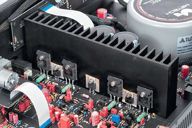 Końcówki mocy to układ w klasie AB z duetem tranzystorów (na kanał). Wspólny radiator znajduje się w centralnej części. Przełączanie źródeł jest zrealizowane tradycyjnie, ale porządnie – za pomocą przekaźników. Obrotowe pokrętło (na przedniej ściance) tylko przekazuje sygnały do mikroprocesora, który wyzwala poszczególne sekwencje sterujące. Rozkazy płyną oczywiście także ze zdalnego sterowania.