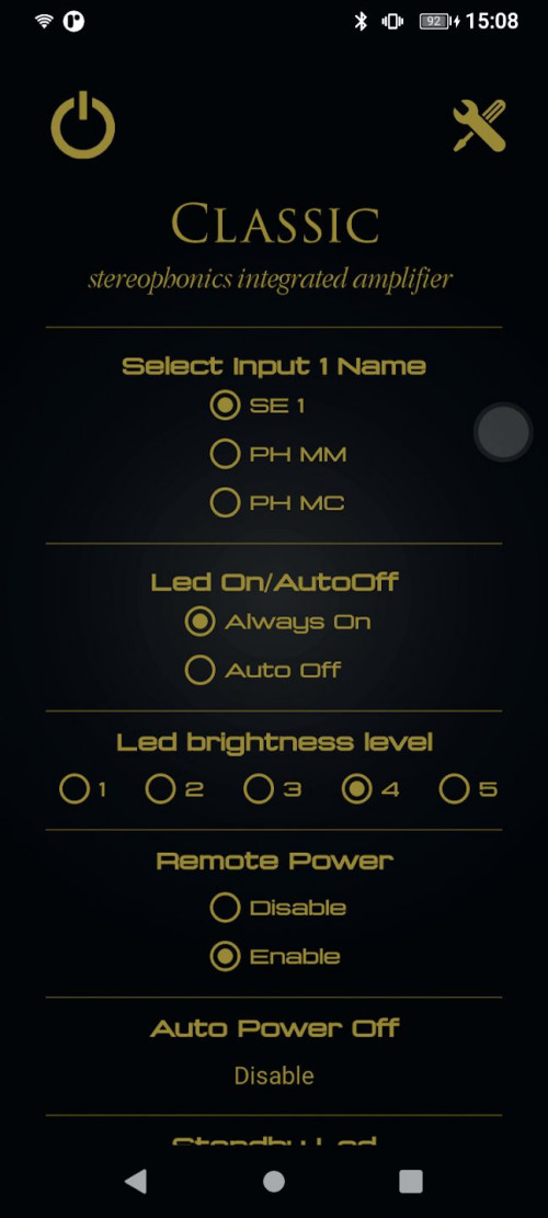 Odbywa się ono z poziomu telefonu oraz aplikacji, którą specjalnie na tę okazję przygotowano. To całkiem rozbudowane (i też klasycznie wystylizowane) narzędzie, którego podstawową rolą jest regulacja głośności i przełączanie źródeł; jest też dodatkowa sekcja ustawień, w której ustalimy szybkość zmian regulatora głośności i dopasujemy zachowanie diod LED; można nawet podejrzeć odczyty z wewnętrznych czujników temperatury.
