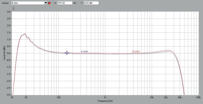 Według danych firmowych moc znamionowa wynosi 2 x 60 W przy 8 Ω i 2 x 100 W przy 4 Ω. Jednocześnie dowiadujemy się o znacznie wyższej mocy w impulsach 10 ms, mającej sięgać 155 W i 240 W (odpowiednio przy 8 i 4 Ω). W naszych pomiarach trzymamy się mocy ciągłej, i właśnie w takich warunkach Classic wykazał się aż 2 x 134 przy 8 Ω i 2 x 196 przy 4 Ω – to ok. dwa razy więcej, niż zapowiadano. A przy jednym kanale wysterowanym, przy 4 Ω mamy 257 W – więcej niż miało być w impulsie.
