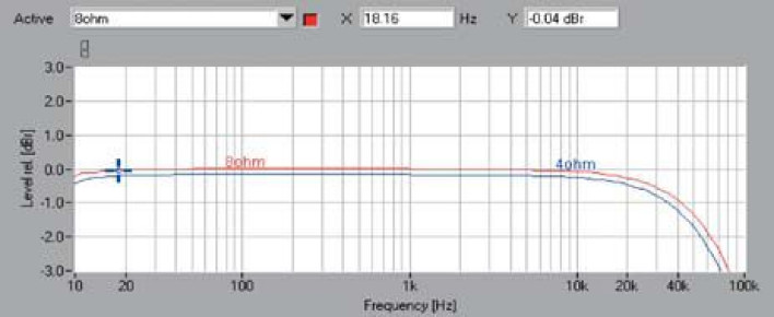 Pasmo przenoszenia (rys. 1) to ideał w zakresie niskotonowym (przy 10 Hz spadek zaledwie -0,15 dB), na drugim skraju -3 dB mamy przy ok. 80 kHz. W spektrum zniekształceń harmonicznych (rys. 2) widać drugą (-75 dB) i trzecią (-81 dB), dalej jest czysto. Z rys. 3. można wnioskować, iż generalnie niższe zniekształcenia uzyskamy z obciążeń 8-omowych. THD+N < 0,1 % przypada na przedziały 1 - 181 W dla 8 omów oraz 2,5 - 274 W dla 4 omów.
