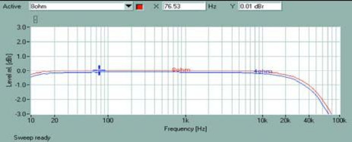 Wzmacniacz dobrze radzi sobie z przenoszeniem częstotliwości w zakresie niskotonowym (rys.1), przy 10 Hz mamy spadek -0,3 dB, wyraźny spadek w sekcji wysokotonowej rozpoczyna się jednak wcześnie, od 10 kHz, a -3 dB pojawia się przy ok. 80 kHz.