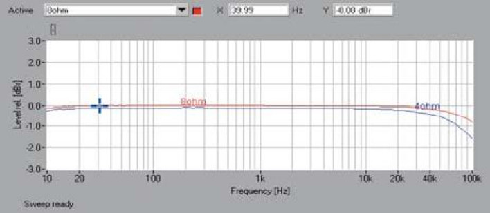 Poziom szumów wynosi 87 dB, co nie jest ani wyczynem ani powodem do krytyki, dynamika to 105 dB. Pasmo przenoszenia (rys.1) wygląda znakomicie, przy obciążeniu 8 omowym A18 osiąga 100 kHz przy -0,8 dB, podczas gdy dla 4 omów jest to -1,6 dB.