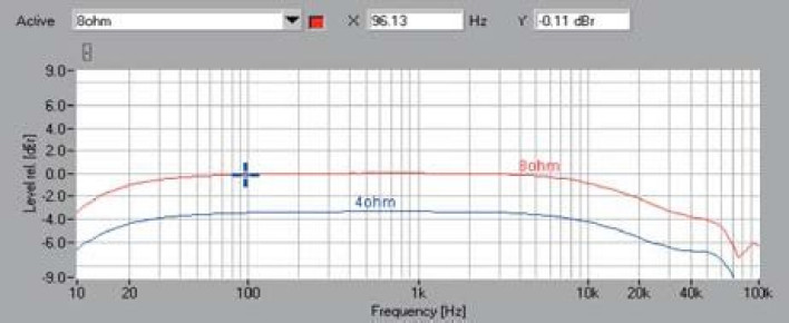 Czułość jest idealna, wynosi 0,17 V. Poziom szumów równy 82 dB jest jak na lampę naprawdę niezły, choć o świetnej dynamice nie może być tu mowy z uwagi na niską moc. Pasmo przenoszenia (rys. 1) pokazuje zaokrąglone skraje pasma, na basie -3 dB uzyskujemy wprawdzie dla 12 Hz, ale dla wysokich tonów to już zaledwie 25 kHz.