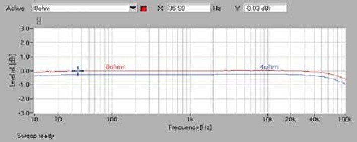 K-5xe w laboratorium pomiarowym czekają spore wyzwania, jako konstrukcja bez sprzężenia zwrotnego jest on ze swojej technicznej natury narażony na problemy w takich dziedzinach, jak poziom szumów, pasmo przenoszenia czy poziom zniekształceń. Tymczasem wskaźnik S/N jest bardzo dobry, sięga 93 dB, a dynamika 114 dB - wyśmienicie. Za to współczynnik tłumienia jest dość niski - 62. Pasmo przenoszenia (rys. 1) wygląda również idealnie, z pomijalnymi spadkami przy 10 Hz i tylko -0,6 dB przy 100 kHz.