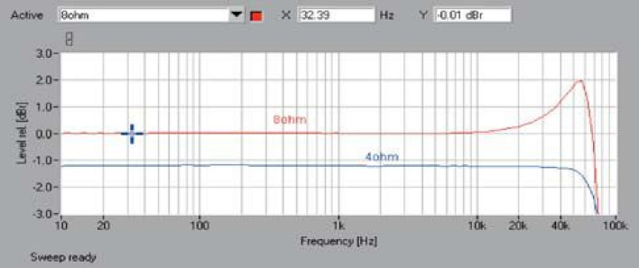 Charakterystyka pasma przenoszenia (rys. 1) jest dla 4 omów bardzo ładna, szybki spadek pojawia się dopiero powyżej 50 kHz (-3 dB przy 72 kHz); impedancja 8 omów wywołuje 2-decybelowe wąskopasmowe podbicie, na szczęście daleko poza pasmem akustycznym - przy 55 kHz.