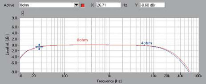 Poziom szumów nie jest bolączką tej konstrukcji, bo 84 dB to jak na lampę bardzo dobrze, choć ze względu na niską moc dynamika osiąga tylko 96 dB. Pasmo przenoszenia (rys. 1) jest ograniczone zarówno od strony niskich (-3 dB przy 13 Hz), jak i (szczególnie) wysokich częstotliwości (-3 dB przy 26 kHz).