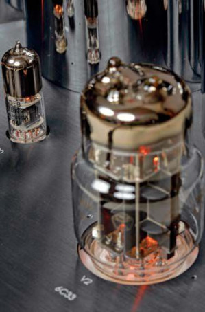 Największe są triody stopnia końcowego 6C33C. Potrzebują one dużych prądów sterujących, a do tego idealnie nadają się podwójne triody 6N30Pi (mała lampa w głębi).