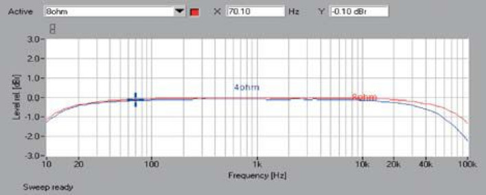 Pasmo przenoszenia (rys.1) również prezentuje się bardzo dobrze. Spadek przy 10 Hz to tylko -1 dB, w zakresie wysokotonowym, jak można się spodziewać, 8 omów uzyskuje lekką przewagę, ale i dla 4 omów przy 100 kHz mamy spadek tylko ok. -2 dB.