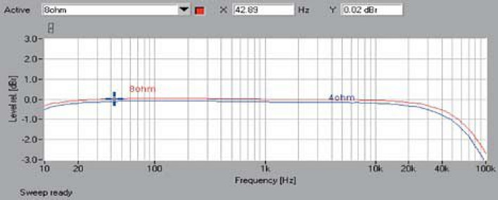 Pasmo przenoszenia (rys.1) z łatwością pokrywa zakres 10 Hz - 100 kHz, spadki wynoszą odpowiednio -0,3 dB oraz -2,6 dB (przy 4 omach nieznacznie gorzej w zakresie najwyższych częstotliwości).