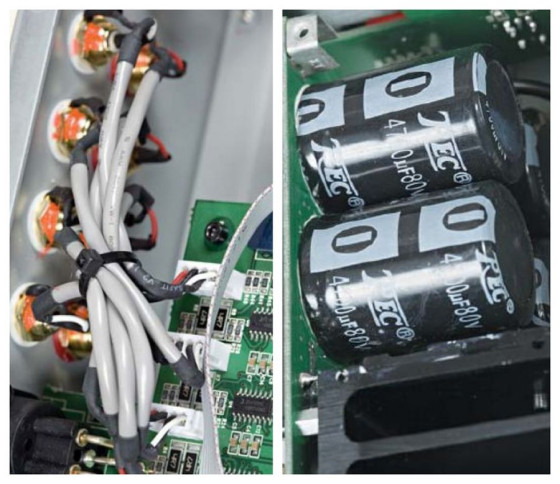 Sygnał z wejść RCA płynie na płytkę przedwzmacniacza ekranowanymi przewodami (fot.1); Pojemności filtrujące zasilacza przesunięto na moduł każdej z końcówek (fot.2).