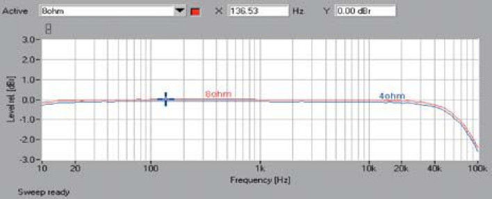 Wzmacniacz kontynuuje dobrą passę w badaniu poziomu szumów - S/N wynosi aż 90 dB, co razem z wysoką mocą wyjściową przekłada się na dynamikę 111 dB.