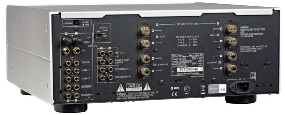 Z tyłu Denona PMA-2010AE w jednym rzędzie umieszczono wejścia liniowe, z wejściem CD na lepszych, większych gniazdach RCA, a także wejście gramofonowe, na które nałożono wtyki zwierające je do masy.