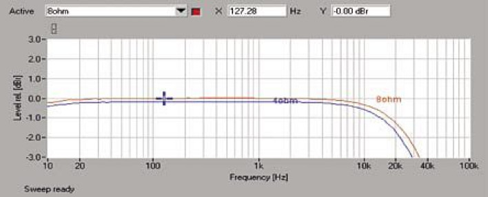 Wzmacniacz nie jest najmniejszy, nie należy także do najtańszych (ani lampowych), w kontekście tego moc wyjściowa jest, mówiąc delikatnie, skromna - zaledwie 2 x 39 W przy 8 omach oraz 2 x 56 W przy 4 omach wymaga wyboru kolumn głośnikowych o przyzwoitej efektywności. Czułość urządzenia wynosi 0,3 V, jest więc bliska standardowego poziomu. Do specjalnych osiągnięć nie można zaliczyć odstępu od szumu, -85 dB to poniżej przeciętnej, a z powodu umiarkowanej mocy dynamika także nie wspina się na wyżyny, osiąga równe 100 dB.