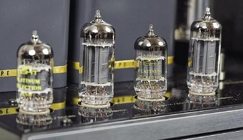 W Air Tight ATM-300 posłużono się trzema stopniami wzmocnienia. Zaczynając od wejścia, sygnał wędruje do podwójnej triody 12AU7A, na której widnieją nadruki z logo producenta oraz sygnatura Platinum Selection.