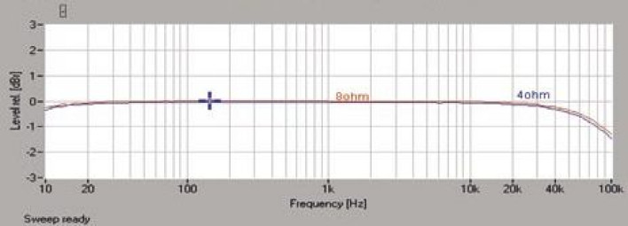 Pasmo przenoszenia (rys.1.) jest bardzo szerokie, przy 10 Hz spadek wynosi kilka dziesiątych decybela, przy 100 kHz jest również bardzo dobrze (-1,2 dB przy 8 omach i -1,4 dB przy 4 omach). Charakter zniekształceń (rys. 2.) defi niują parzyste harmoniczne, druga (-76 dB) oraz czwarta (-84 dB), kolejne są również widoczne, ale już poniżej -90 dB.