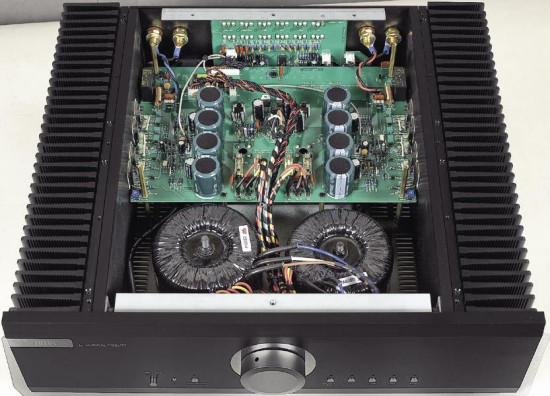 Transformatory sieciowe znajdują się blisko przedniej ścianki, na centralnej płytce -znów niezależnie dla każdego kanału, znalazła się bateria kondensatorów filtrujących. Układ prostowników odizolowano od płytki i wkręcono w dolną część chassis, prowadząc w ten sposób chłodzenie poprzez dużą metalową płytę spodu.