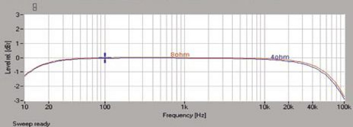 Na skrajach pasma przenoszenia (rys.1.) pojawiają się umiarkowane spadki, -1,2 dB przy 10 Hz, a przy 100 kHz ok. -3 dB. Tylko druga harmoniczna (-87 dB) wykracza poza granicę -90 dB (rys. 2.), dalsze leżą już poniżej, ginąc w widmie wysokiego szumu. Aby uzyskać zniekształcenia THD+N poniżej 0,1 %, potrzebna będzie moc wyjściowa wyższa od 3 W przy 8 omach oraz 6 W przy 4 omach. Stello zachowuje się pod tym względem jak typowy wzmacniacz tranzystorowy z wyraźnie zaznaczonym obszarem przesterowania.