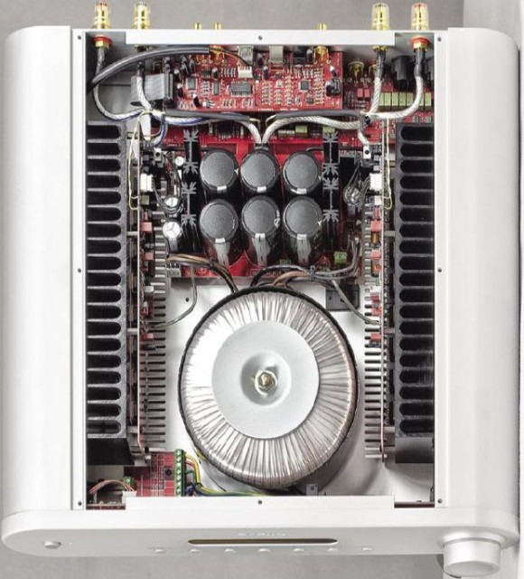 Pomiędzy końcówkami znajduje się zasilacz, a jego podstawą jest bardzo duży transformator toroidalny o mocy 800 W, z którego wyprowadzono osobne uzwojenia dla różnych sekcji. Filtrację zapewnia sześć dużych kondensatorów o łącznej pojemności 90 000 mikrofaradów.