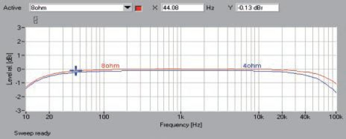 Przede wszystkim moc wynosi 45 W przy 8 omach (2 x 42 W w stereo) i osiąga 64 W przy 4 omach (2 x 55 W w stereo). Towarzyszy jej czułość równa 300 mV oraz wskaźnik S/N o wartości 87 dB - wcale nie jest źle. Dynamice udaje się przekroczyć 100 dB. Wzmacniacz nie musi też wstydzić się pasma przenoszenia (rys.1), które sięga od 10 Hz (-1,4 dB) aż do 100 kHz z niewielkim spadkiem -1 dB przy 8 omach i -1,7 dB przy 4 omach. Tylko druga oraz trzecia harmoniczna (rys. 2) docierają do pułapu -90 dB, dalsza część widma jest niemal idealnie czysta.