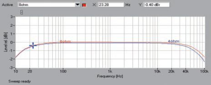 Szumy nie są rewelacyjnie niskie (-85 dB), ale też niewiele wyższe niż w innych wzmacniaczach tego testu. Pasmo przenoszenia (rys.1) wygląda przyzwoicie, widać spadki na skrajach, jednak zarówno przy 10 Hz, jak i 100 kHz udaje się utrzymać w zakresie -2 dB.