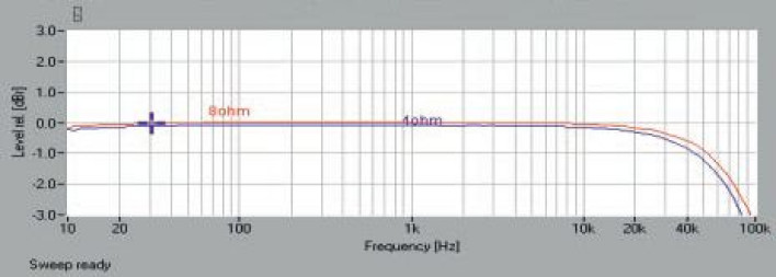 Spektrum zniekształceń (rys. 2) jest niemal idealnie czyste, jedyną harmoniczną przebijającą się przez widmo szumów jest trzecia, której poziom to niskie -92 dB, a gdzieś na granicy -100 dB widać jeszcze piątą. Również wykres zniekształceń z rys. 3. prezentuje się wyśmienicie, poziom 0,1 % dostępny już od 0,15 W przy 8 omach i 0,3 W przy 4 omach, a w szerszych zakresach (11-51 W/8 omów i 23-92 W/4 omów) przełamuje barierę 0,01 %.
