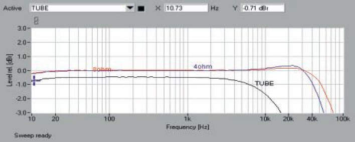 Odstęp S/N wynosi 73 dB w trybie tranzystorowym i 71 dB w hybrydowym, a dynamika odpowiednio: 99 dB i 97 dB. W pomiarze pasma przenoszenia (rys.1) pojawiają się tym razem trzy charakterystyki. Bazowy zestaw tworzą krzywe dla 8 omów i 4 omów, które od 10 Hz prezentują się znakomicie, sięgając do ok. 30 kHz, powyżej których zaczyna się wyraźny spadek. -3 dB można znaleźć przy 75 kHz dla 8 omów i 60 kHz dla 4 omów.