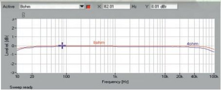 Sesja pomiarowa pokazała, że możliwości urządzenia są znacznie większe. Wzmacniacz generuje 121 W przy 8 omach i 139 W przy 4 omach, a w trybie dwukanałowym odpowiednio 2 x 120 W i 2 x 127 W. Czułość 0,33 V jest niższa od standardowej, ale nie sprawi problemu żadnemu ze źródeł dźwięku. Radość, a nawet euforię wywołuje odstęp od szumów, wynoszący aż 92 dB, dzięki czemu dynamika wznosi się na pułap 113 dB.