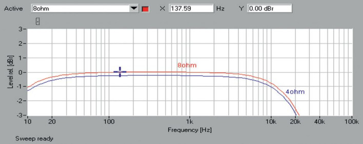 Pasmo przenoszenia (rys.1), chociaż pokrywa zakres akustyczny, to w porównaniu z innymi wzmacniaczami jest wyraźnie ograniczone. Spadek przy 10 Hz wynosi ok. -1 dB, na drugim skraju charakterystyka opada już powyżej 5 kHz, pokazując spadek -3 dB w okolicach 20 kHz.