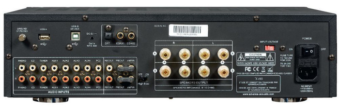 Pomiędzy rządkiem wejść i podwójnymi wyjściami głośnikowymi umieszczono niewielki przełącznik – "High Bias", pozwalający wybrać punkt pracy tranzystorów końcowych. W położeniu "Off" pracują jak w klasycznym wzmacniaczu AB. Przy "On" kilkanaście pierwszych watów oddawanych jest w klasie A.