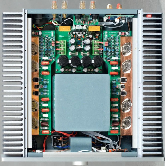 Wejścia analogowe są przełączane w układach scalonych. W każdym kanale pracują po dwie komplementarne pary tranzystorów Toshiba (2SA1941 + 2SC5198) przykręconych do dużego radiatora. Przygotowano też rozbudowany zasilacz, z transformatorem toroidalnym o mocy 400 W.