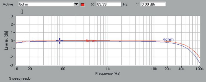 Pasmo przenoszenia (rys.1) wygląda wybornie w zakresie niskich częstotliwości (-0,2 dB przy 10 Hz), delikatny spadek rozpoczyna się powyżej 20 kHz, ale przy częstotliwości 100 kHz wynosi tylko -2 dB dla 8 omów i -2,5 dB dla 4 omów.
