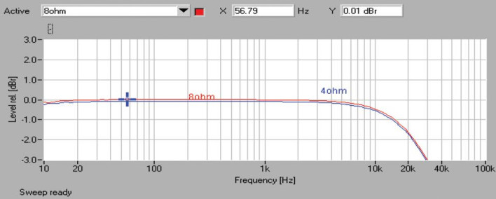 NAD deklaruje moc wyjściową 2 x 30 W przy 8 omach. Nie wiem, czy dostałem jakiś inny wzmacniacz, ale "mój" D3020 oddawał aż 66 W przy 8 omach i 132 W przy 4 omach. Dokładnie dwukrotny przyrost na dwa razy niższej impedancji!