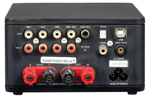 Micromega MyAmp ma wszystkie układy w jednej obudowie, udało się tam również zmieścić zasilacz, z ulokowaniem gniazd na wysokim tylnym panelu nie było większych kłopotów, miejsca wystarczyło także na złącze sieciowe.