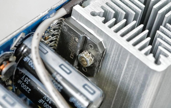 Producent sięgnął po "zwykłe" końcówki mocy, pracujące w klasie A/B. Rodzi się od razu pytanie o skuteczność chłodzenia, zwłaszcza w plastikowej obudowie. Poradzono sobie z tym instalując radiator w poprzek wzmacniacza, w formie tunelu dosuniętego do bocznych ścianek, w których wycięto kwadratowe otwory.